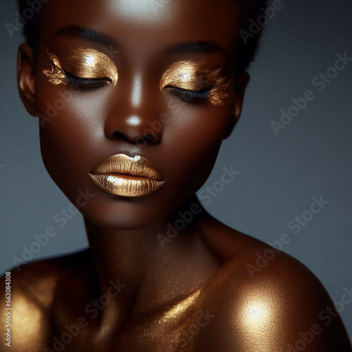 african woman face with gold eyeshadow and lips