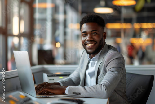 African-American businessman happily working at a desk in a cold office with air conditioning controls.