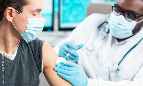 African-American doctor makes a coronavirus vaccine using a syringe and hypodermic needle. Professional medical worker and patient at the hospital office. Vaccination and safety.