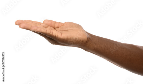 African-American man holding something in hand on white background, closeup