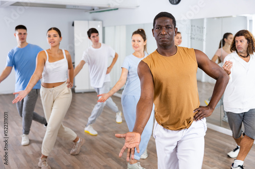 African-american man practicing active dance moves during rehearsal with group in dancing studio.