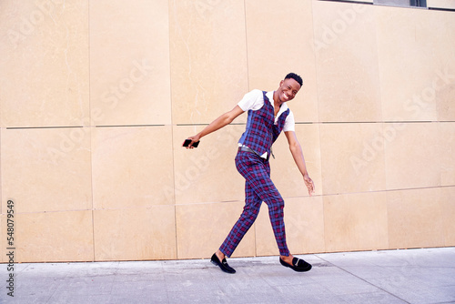 African-American man walking funny in a casual plaid suit, waistcoat and short-sleeved shirt.