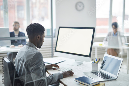 African-american office manager in formalwear sitting in front of computer monitor while analyzing online data