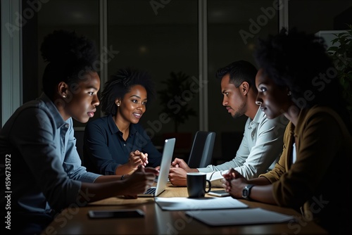 African-American Team: Late Night Office Collaboration and Strategy Planning with Diverse Employees
