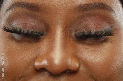 African-american young woman's close up portrait. Beautiful female model in white shirt with well-kept skin. Human emotions, facial expression, beauty. Calm, confident. Eyes with deep brown color.