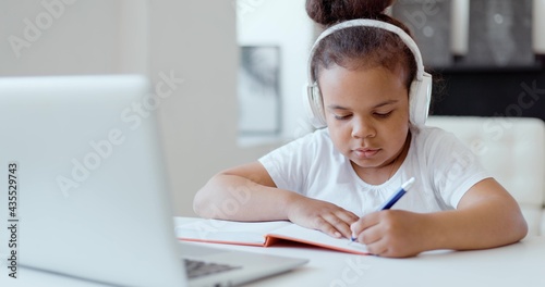 Afro american kid girl school pupil wearing headphones studying online from home watching web class lesson or listening tutor by video call elearning on pandemic isolation. Children remote education.