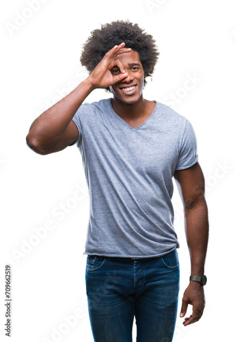 Afro american man over isolated background doing ok gesture with hand smiling, eye looking through fingers with happy face.