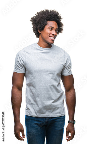 Afro american man over isolated background looking away to side with smile on face, natural expression. Laughing confident.