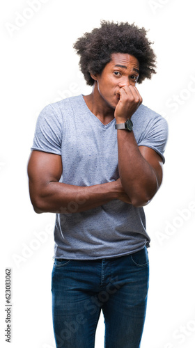 Afro american man over isolated background looking stressed and nervous with hands on mouth biting nails. Anxiety problem.