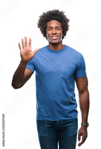 Afro american man over isolated background showing and pointing up with fingers number five while smiling confident and happy.
