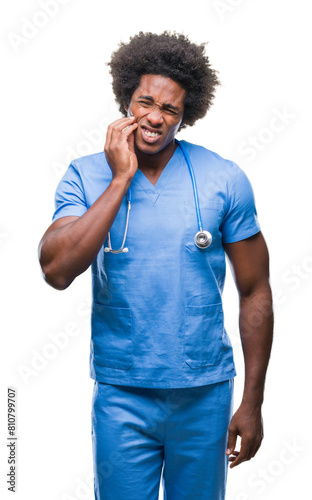 Afro american surgeon doctor man over isolated background touching mouth with hand with painful expression because of toothache or dental illness on teeth. Dentist concept.