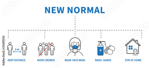 After the epidemic the Covid-19 to new normal. Coronavirus COVID-19 Prevention. Flat line icons set. Social distancing, Wear face mask, Wash hands. Vector illustration