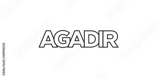 Agadir in the Morocco emblem. The design features a geometric style, vector illustration with bold typography in a modern font. The graphic slogan lettering.