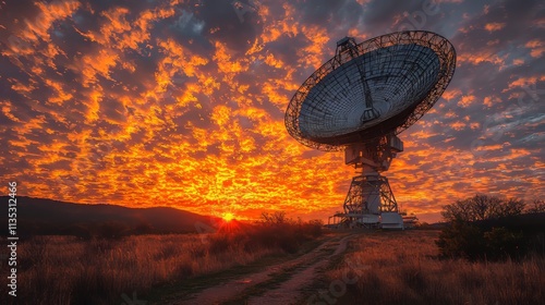 Against a dramatic sky, a massive parabolic antenna represents technology, communication, satellite, and receiver dish.