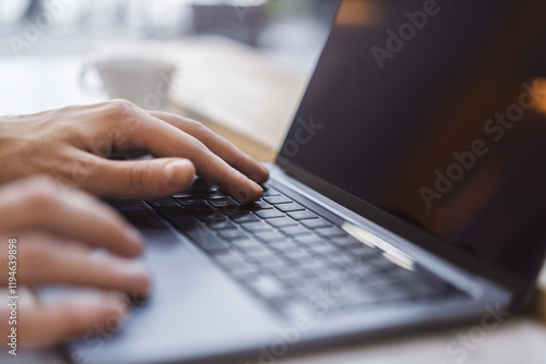Against a fuzzy office backdrop, a close-up captures a man's hands deftly navigating a modern laptop's keyboard.