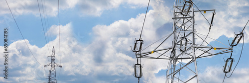 Against a panoramic background of clouds, the poles of a high-voltage overhead line can be seen.