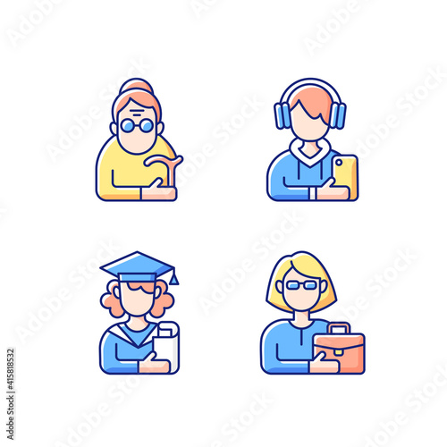 Age and gender differences RGB color icons set. Female pensioner. Male teenager. Adulthood. Senile woman. Adolescence. School stress, peer problems. Old-old age. Isolated vector illustrations