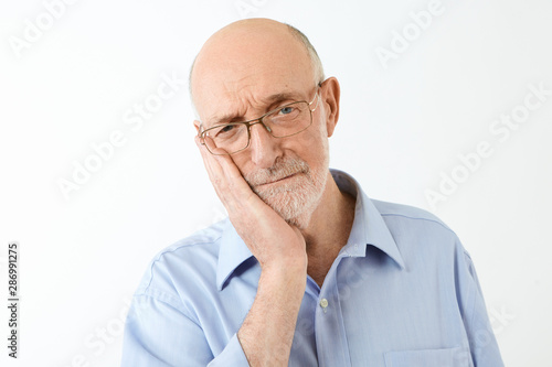 Age and mature people concept. Isolated shot of upset European male pensioner with bald head and thick beard touching cheek, suffering from intolerable toothache, having miserable painful look