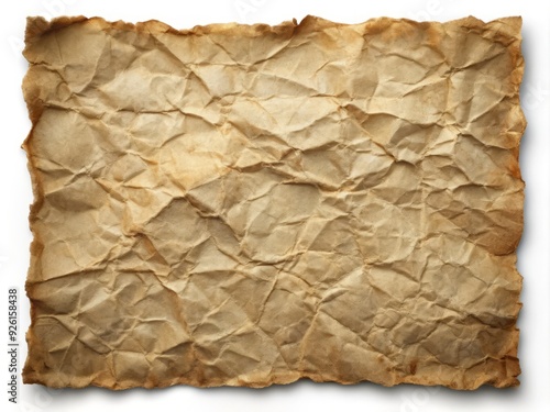 Aged, crumpled, and torn parchment paper with a grey-brown wrinkled texture, resembling a vintage letter, perfect for adding a grungy, distressed look to designs.