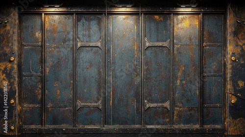 Aged industrial metal wall with grungy rust texture, dark panels, rivets, and overhead lighting in a sci-fi style environment.