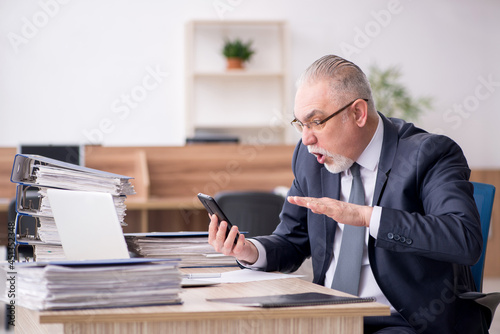 Aged male employee sitting at workplace