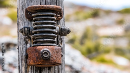 Aged Metal Insulator on Wooden Pole: Close-Up of Rust-Resistant Texture with Blurred Background