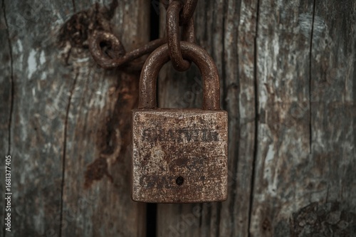 Aged metal lock secured on a chain. Classic antique padlock. Durable lock to fasten a chain.