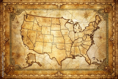 Aged parchment map of Midwest with hand-drawn illustrations, ornate frame, classic exploration era feel, muted earth tones, and subtle texture.