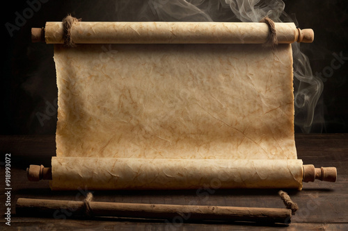 Aged Parchment Stretched Between Wooden Rods with Dramatic Smoke on Dark Background