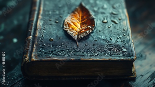 Aged tome with leaf, weathered texture, and rain-kissed cover symbolizing impermanence