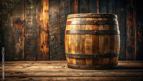 Aged whiskey barrel with a distressed finish on the exterior, rustic, whiskey barrel