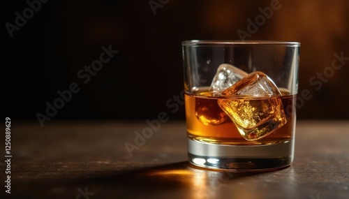 Aged whiskey in a short tumbler, ice clinking gently on mahogany , retro, relaxation, scotch