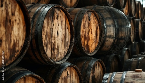 Aged Wooden Barrels in a Cellar Ready for Wine or Whiskey Storage and Fermentation
