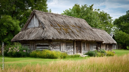 Aged wooden dwelling features thick thatched roofing surrounded by lush greenery and field grasses.