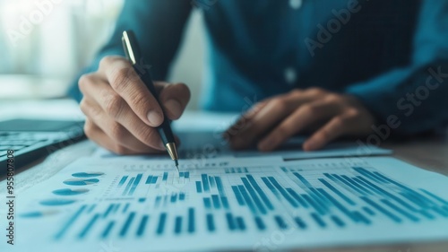 Agent crafting a targeted marketing strategy on a computer, with graphs and data analysis tools open Targeted marketing, real estate planning