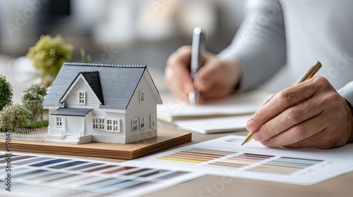 Agent works with color samples and architectural designs, planning a residential project in a stylish minimalist office