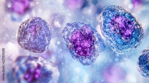Aging cells under a microscope in a laboratory setting. Featuring biological aging and cellular breakdown