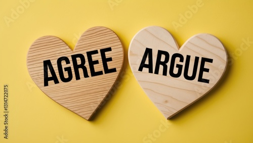 Agree or Argue symbol. Concept words on wooden hearts. Attractive yellow backdrop. Business and concept. Space for text.