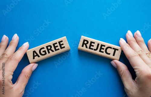 Agree or Reject symbol. Concept word Agree or Reject on wooden blocks. Businessman hand. Beautiful blue background. Gender and Agree or Reject concept. Copy space