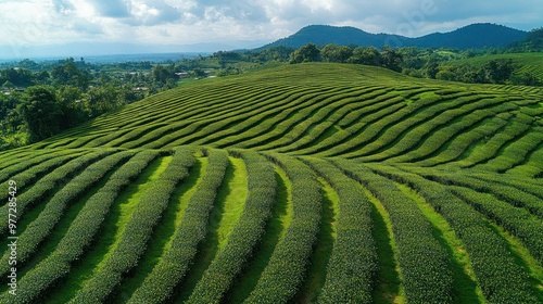 Agricultural area green tea on mountain Chiang rai Thailand, Aerial view of the mountainous area where the tea plantations are located.