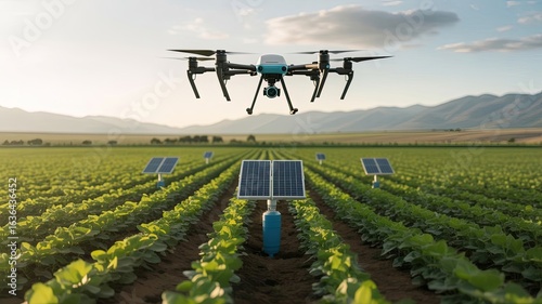 Agricultural drone over field: A high-angle perspective captures an agricultural drone hovering over a verdant field of crops, next to solar panels in a sun-kissed, modern agricultural setting.