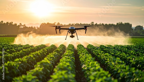 Agricultural Drone Spraying Crops at Sunset for Precision Farming