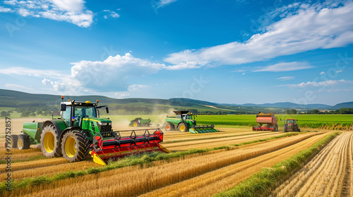 Agricultural Efficiency, Modern tractors in a vast golden wheat field under a clear blue sky.