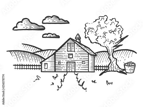 Agricultural Farm rural landscape sketch engraving vector illustration. Scratch board style imitation. Black and white hand drawn image.