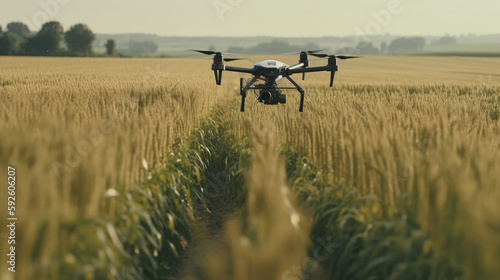Agricultural field with crops and agronomist drone. Al generated