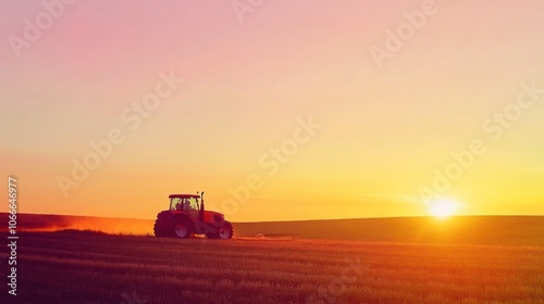 Agricultural tractor in a field at sunset, with dust rising from the soil, symbolizing farming and rural life.