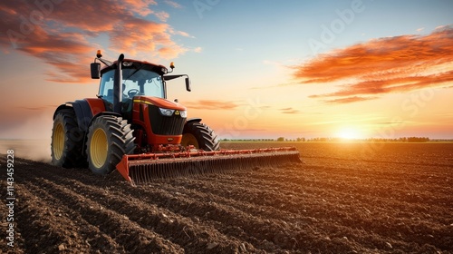 Agricultural Tractor Working in the Field at Sunset, Cultivating Soil with Beautiful Sky Colors and Agricultural Landscape in the Background