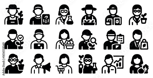 Agriculture and biology solid icons set – filled, farming, scientific symbols