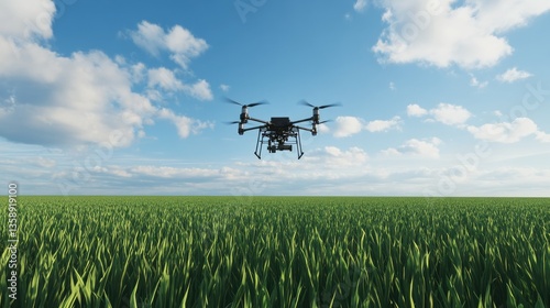 Agriculture drone flying over the field and spraying crops with chemicals.