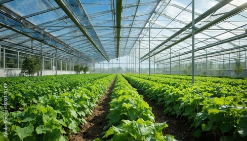 Agrivoltaics innovation combines farming and solar energy. Panels installed above crops optimize land use, generate renewable power. Greenhouse cultivation of vegetables, plants.